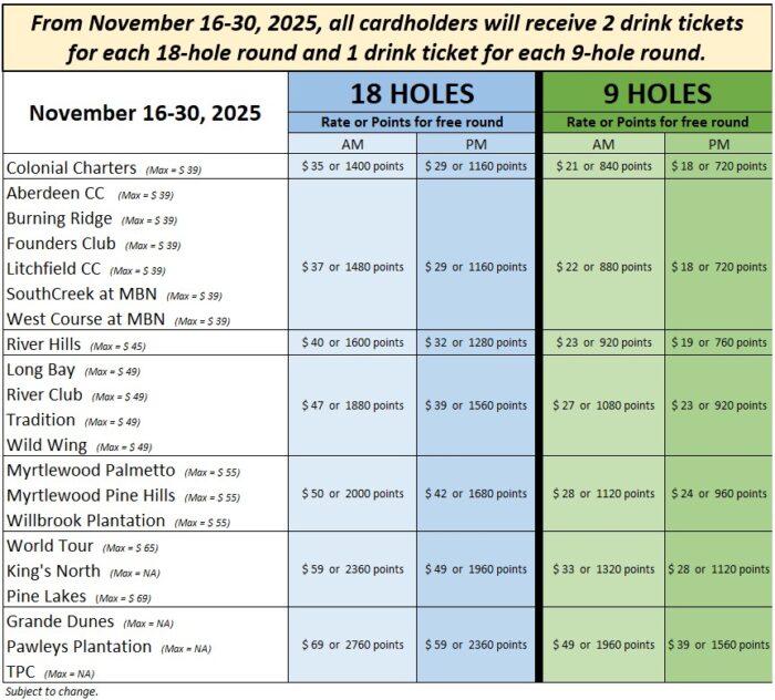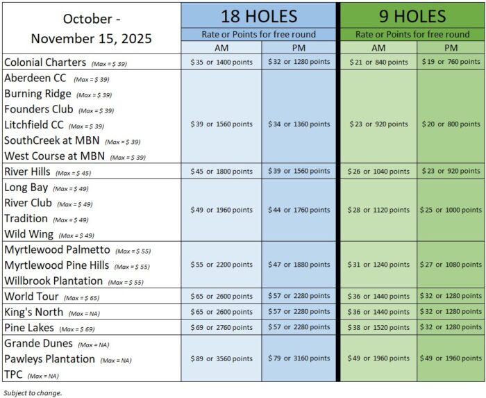 You will earn 10 points per dollar (excluding tax) for all paid Honors Club rounds. See chart below for rates through November 30, 2025. You can keep track of your points on this website or at check in at the course.