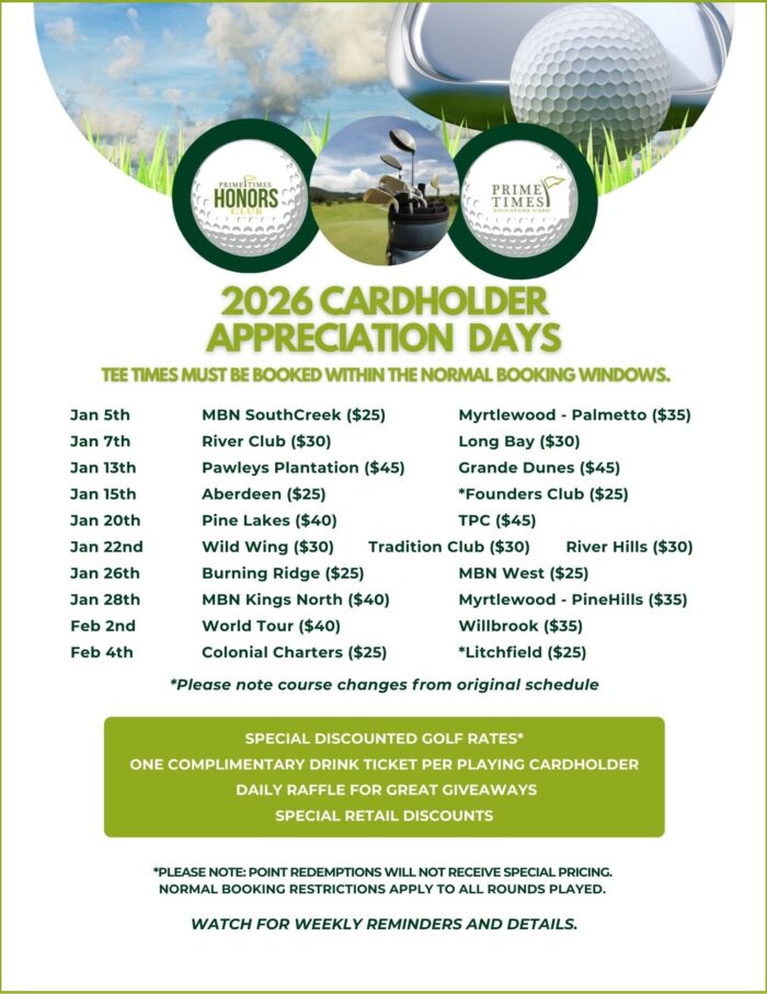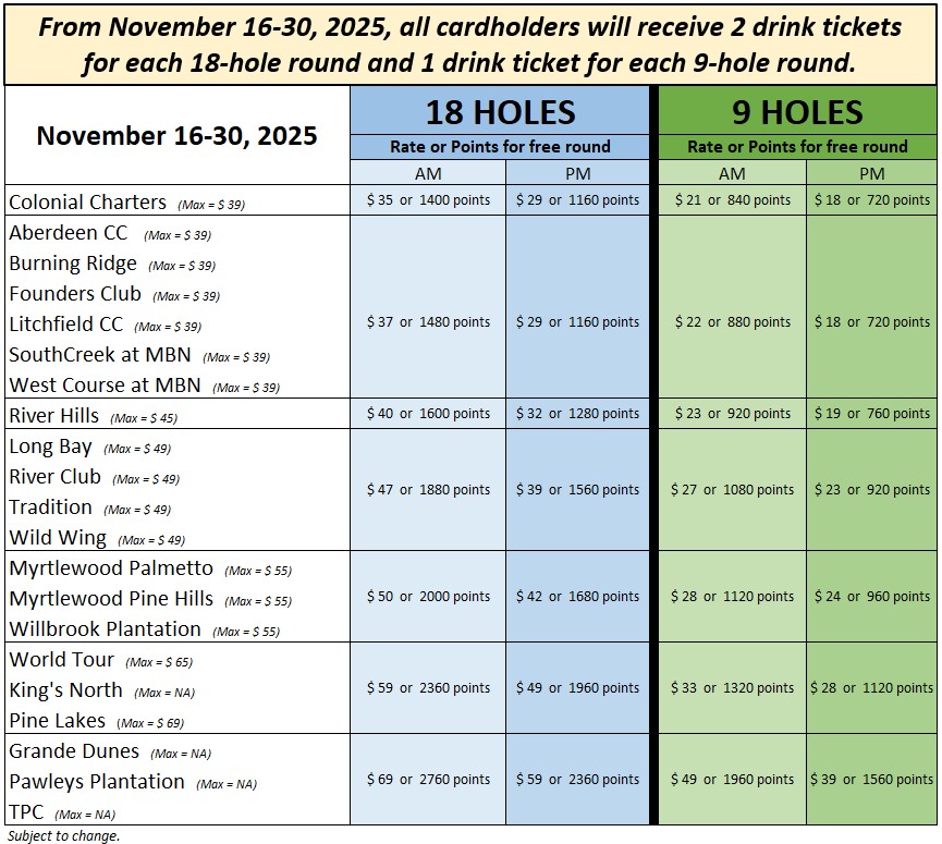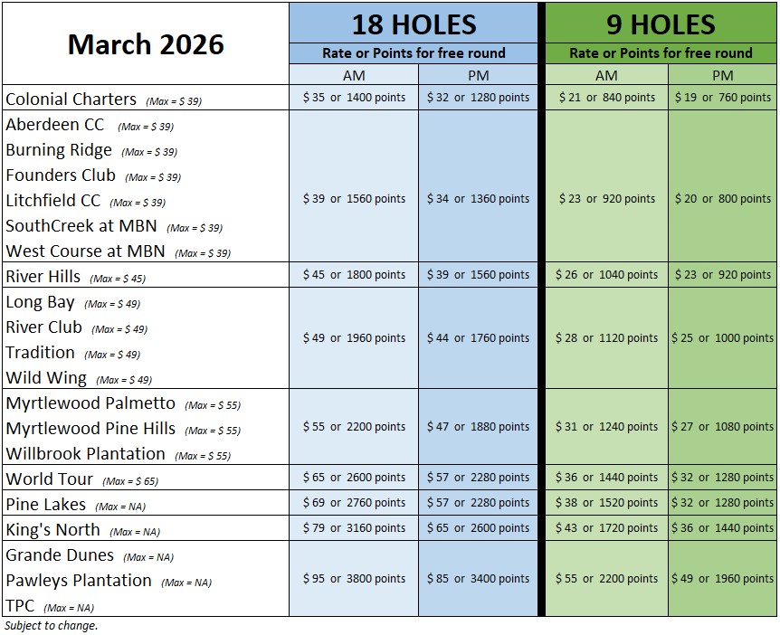- Maximum Rates at King’s North, Pawleys Plantation, TPC and Grande Dunes will vary based on availability.